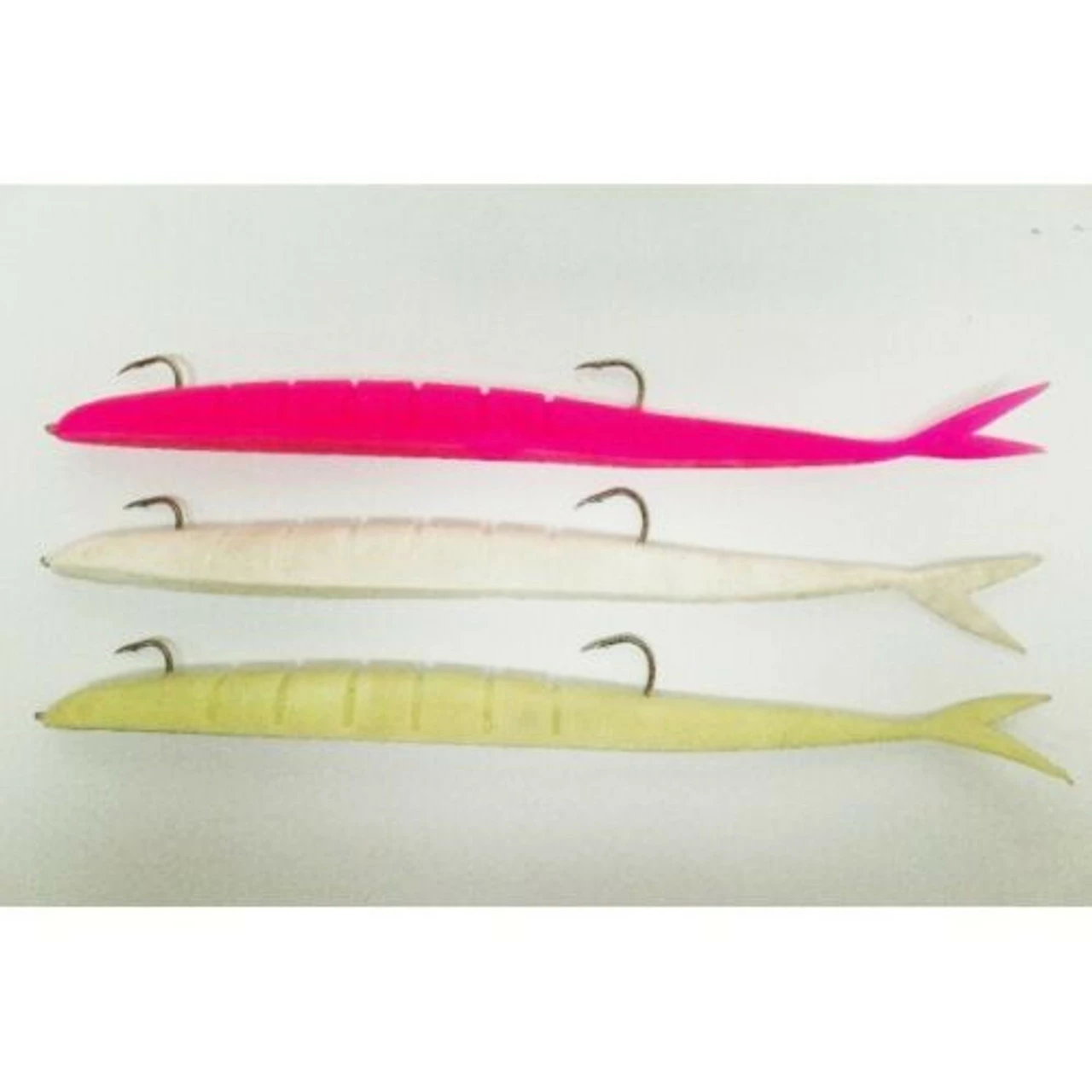 There are two sizes available β 12-inch and 8-inch β and both are pre-rigged with two extremely sharp and strong hooks. Colours available include pearl white, vibrant pink, and lumo.