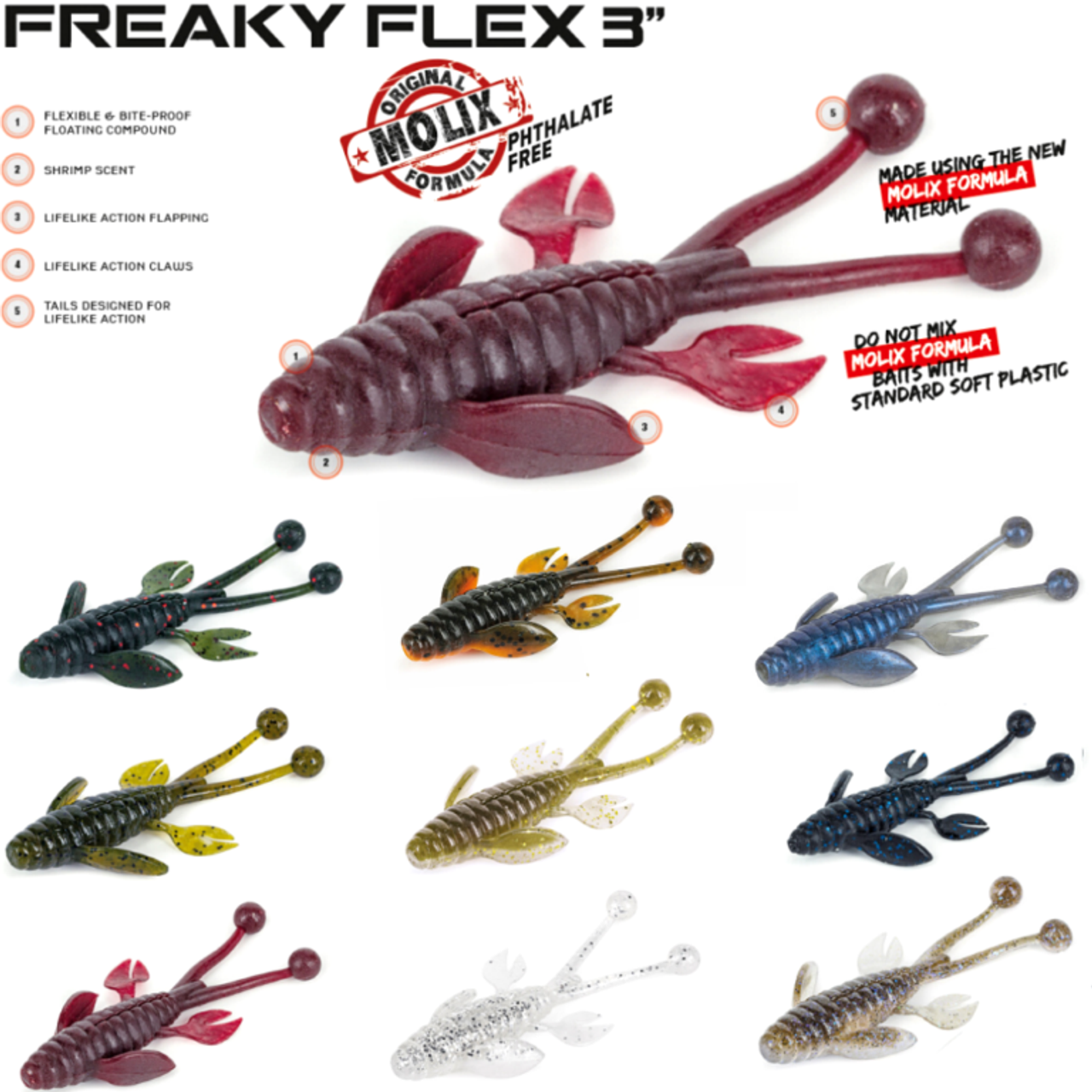 Freaky Flex is a small creature that perfectly combines the details and the functionalities. It is made of a new MOLIX FORMULA developed by Molix, it is an extremely soft and flexible floating compound, which is more cut resistant,Ā and it is enriched with salt and shrimp scent. The special appendices create micro vibrations during the swimming action which, combined with the floating characteristics of the material, guarantee a stand-upĀ effect of the bait while it is jumping off the bottom. The Freaky Flex allows different kind of rigs, it is suitable both for finesse fishing and for big predators.